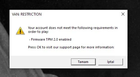 her zaman windows 10 bilgisayarımda giriş yapıp oyun oynadığım hesabıma internet kafede giriş yapmak istedim, internet kafedeki bilgisayar windows 11'di ve muhtemelen tpm 2.0 aktifti, oyunumu oynayıp kalktım. Daha sonra kendi hesabım üzerinden oyuna girmeye çalıştığımda TPM 2.0 hatası verdi, bilgisayarım TPM 2.0 ve Secure Boot desteklemiyor bios ayarlarından bu seçenekleri aktif etmeme rağman tpm 2.0 hatası almaya devam ediyorum. Bu hata sadece benim hesabımda oluyor kendi hesabımdan farklı bir hesapla oyuna girebiliyorum. Bu sorunu nasıl çözerim?