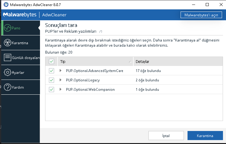 AdwCleaner daha farklı anti-virüs ve anti-malware yazılımların bulamadıklarını bulabiliyor. Eğer AdwCleaner ile tarattıktan sonra bir şey çıkarsa silin karantinadan sonra daha problem devam ederse temiz kurulum gerçekleştirin.