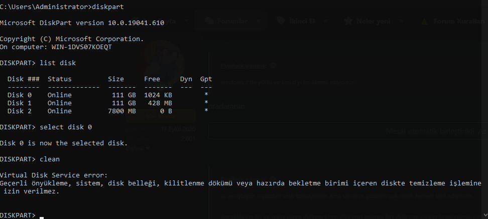 denediklerim biçimlendir format atarken disk seçme bölümünden sil cmd den seçip sil dis yöneticisinden sil bunları denedim hiçbiri olmadı