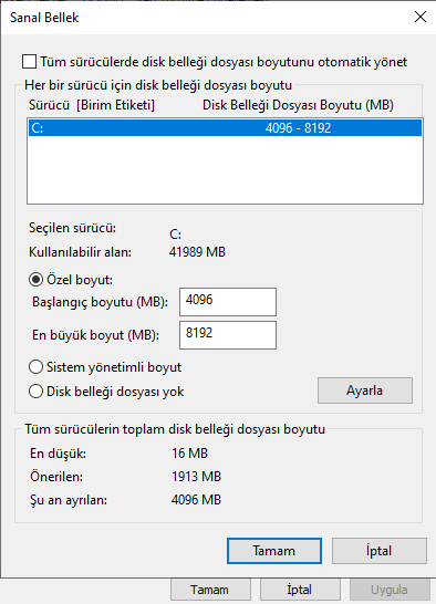 Gelişmiş Sistem Ayarları > Gelişmiş > Performans > Gelişmiş > Sanal Bellek buranın ekran görüntüsünü atarmısın?
