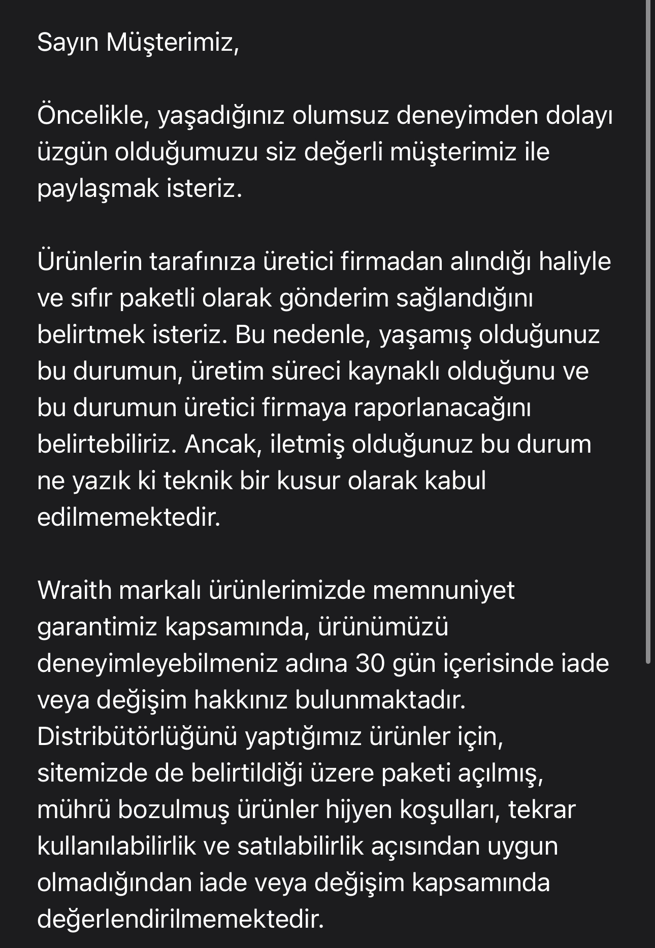 Arkadaşlar dün konusunu açmıştım Wraithesports’dan ScyRox V6 isimli mouse’u satın almıştım fakat kutuyu açar açmaz ürünün fazla tozlu ve lekeli olması + skatezlerinde çizik olmasından dolayı şüphelendim sonra biraz araştırdım ve başka bir forumda da birinin buna benzer şikayeti olduğunu hatta o kişiye gönderilen mousepad’in üstünde kedi kılından tutun ilk sahibinin fatura adresine kadar durduğunu okudum bana gelen mouse’un da resimlerini aşşağıya bırakıyorum kutusunu açar açmaz bu şekilde bir mouse karşıma çıktı kendileriyle iletişime geçince de bu şekilde şaka gibi bir yanıt verdiler ne yapacağımı bilmiyorum siz siz olun wraithesportsdan ürün almayın ha alacaksanız da dikkat edin 2. el kullanılmış ürün çıkabileceğinin bilincin de olarak alın…