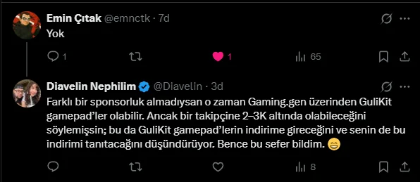 Emin Çıtak’ın genellikle sponsorları ASUS, Gaming.gen ve SteelSeries. Bu markaların da genelde uygun fiyatlı ürünleri olmuyor. Tarif edilene göre belki Gaming.gen indirime girerse GuliKit KK2 T 2000 TL altına düşebilir. Bunu da şuradan çıkarıyorum: Attığım ekran görüntüsünde, 2–3 bin TL fiyat bandından şikâyet eden birine “daha uygun olacağı” söylenmişti. Yani ancak indirime girerse fiyat düşer.