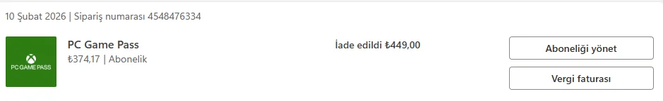 10 Şubat tarihinde Xbox üzerinden banka kartımla 449 TL tutarında satın aldığım Xbox Game Pass aboneliğini aynı gün içinde iade ettim. Buna rağmen üzerinden 8 gün geçmesine karşın ücretim hâlâ hesabıma yatmadı.