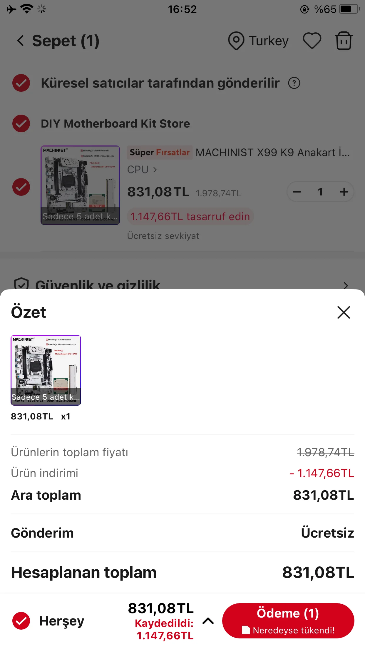 Bunu sepete ekleyebildim yani şimdi vergi dahil 831 TL mi ?