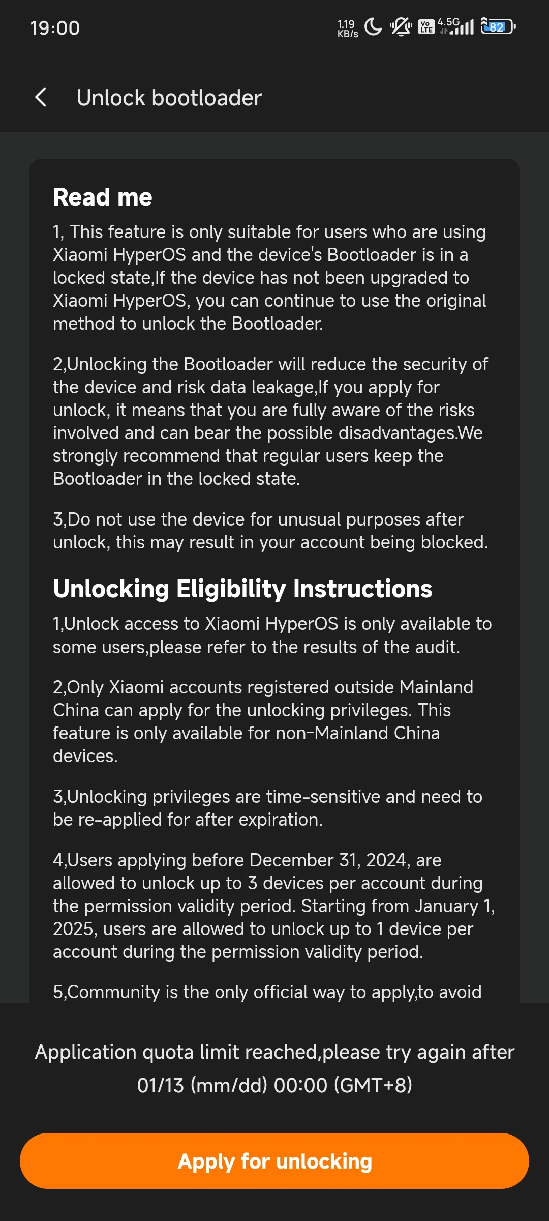 Valla gerçekten bıktım. Kaç gündür deniyorum ama olmuyor. Neymiş günlük kota hızlı doluyormuş. Bootloader açmanın tek iyi yolu da buymuş falan filan. Artık yeter valla bi Android özelliğini kullanmak için neden bu kadar uğraşıyorum kardeşim telefon benim değil mi ya. Valla bilgisayarım yok ama bildiğiniz yöntem varsa arkadaştan halledebilirim. Günlük kota için de saat tam 19.00 (Çin saati ile 00.00 çünkü) olduğunda deniyorum ama yine de nafile. Bootloader kilidini açıcam diye çıldırıcam. Ekran fotoğrafında da görebilirsiniz saat tam 19.00. Telefonum Poco F4 yurtiçi