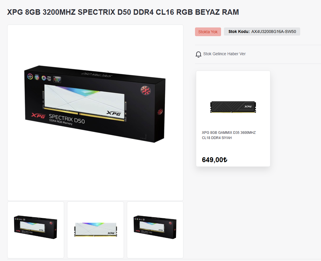 AX4U32008G16A-SW50 - XPG 8GB 3200MHZ SPECTRIX D50 DDR4 CL16 RGB BEYAZ RAM