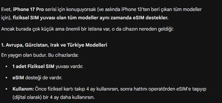 Getirildiği ülkeye göre değişiyor diye biliyorum. Bazıları çift fiziksel bazıları da çift e-SIM. Tek fiziksel tek e-SIM var mı bilmiyorum. Çift e-SIM modellerde ekstra efor sarf etmen gerekiyor mu bilmiyorum fakat bataryaları daha büyüktür.anladımm cok tesekkur ederım 17pro da iki adet mı sim yuvası var
