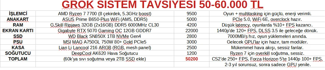 Her yapay zekaya, "Selam. Bana 40.000 - 60.000 ve 80.000 TL'lik bilgisayar toplamamda yardımcı olur musun? Sadece kasa ve içindekiler lazım, monitör vs istemiyorum. Lütfen parçaları, markaları, modelleri ve o modelleri neden seçtiğini de sebebiyle beraber tablo halinde gönderirsen sevinirim" yazdım. Bu yazdığımı belirttim çünkü, gelen cevaplar enteresan. Bazılarında fiyat yok falan. Bakalım DonanımArşivi bilgisayar guruları hangi yapay zekaya, ne kadar katılacak. Benim açımdan, bana gönderdikleri içerik sebebiyle ChatGPT > Grok > GEMINI > Preplexity'dir.