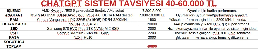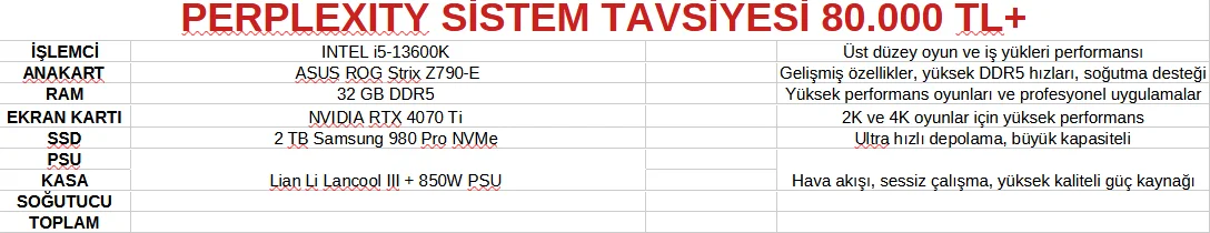 Arkadaşlar selamlar. İlk önce şunu belirteyim ki YAPAY ZEKA DESTEĞİ İLE BİLGİSAYAR TOPLAMA GİBİ BİR NİYETİM YOK. Eskiden hem yönetici olduğum forumda hem de moderatör olduğum diğer forumlarda böyle bir konu açmıştım. Şimdi başka bir yapay zeka aracı olan Perplexity'i de ekleyip tekrardan, yeni fiyatlar üzerinden böyle bir içerik yapayım dedim.