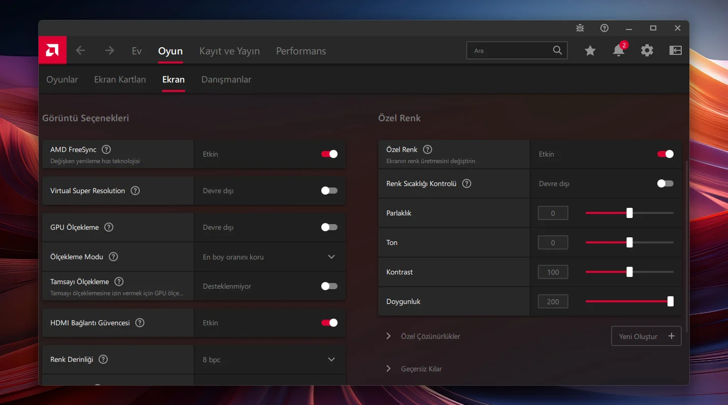 Benim de AMD. Direkt AMD Adrenalin yazılımından aşağıdakini yap. Oyun > Ekran > Özel Renk tik at açılan menüden Doygunluğu fulleAmd mi nereden yapacagim onu benim kart amd hocam