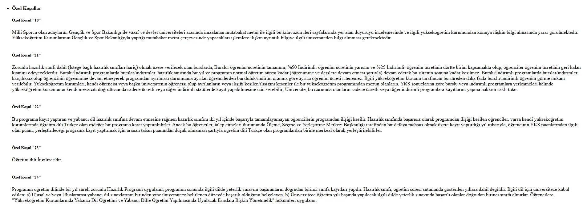 Son 1-2 saat kala tercih yaptım. Tercihlerimi iyice inceleyip 24 üniversiteyi seçip hepsini yazdım. Sonra başvuru ön izle dediğimde şöyle bir şey çıktı: 14, 21, 22, 23 ve 24. özel koşulları tarafınızca tanımlanmamış mıydı? Neymiş, bir şekilde ihlal ediyormuşum (hatta bir koşul daha vardı ama kaç numara olduğunu hatırlamıyorum).